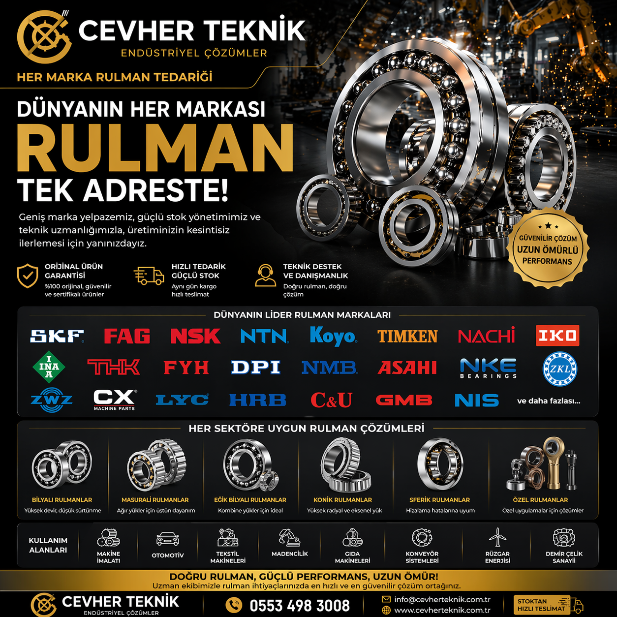 Endüstriyel üretimde süreklilik ve verimlilik, doğru rulman seçimi ile başlar. Cevher Teknik olarak; SKF, FAG, NSK, NTN, KOYO, TIMKEN, NACHI ve IKO başta olmak üzere dünyanın önde gelen rulman markalarını geniş stok ve hızlı tedarik avantajıyla sunuyoruz.