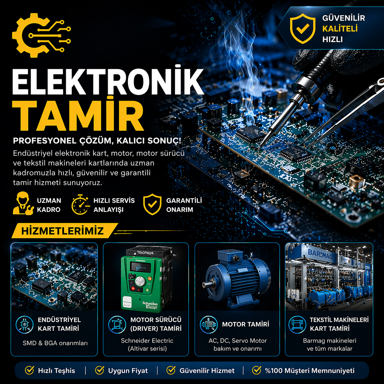 Hızlı teşhis, uygun maliyet, kaliteli işçilik ve garantili hizmet anlayışımızla; üretiminizin durmaması için yanınızdayız. Elektronik tamir ve tedarik ihtiyaçlarınızda güvenilir çözüm ortağınız olmaya hazırız.