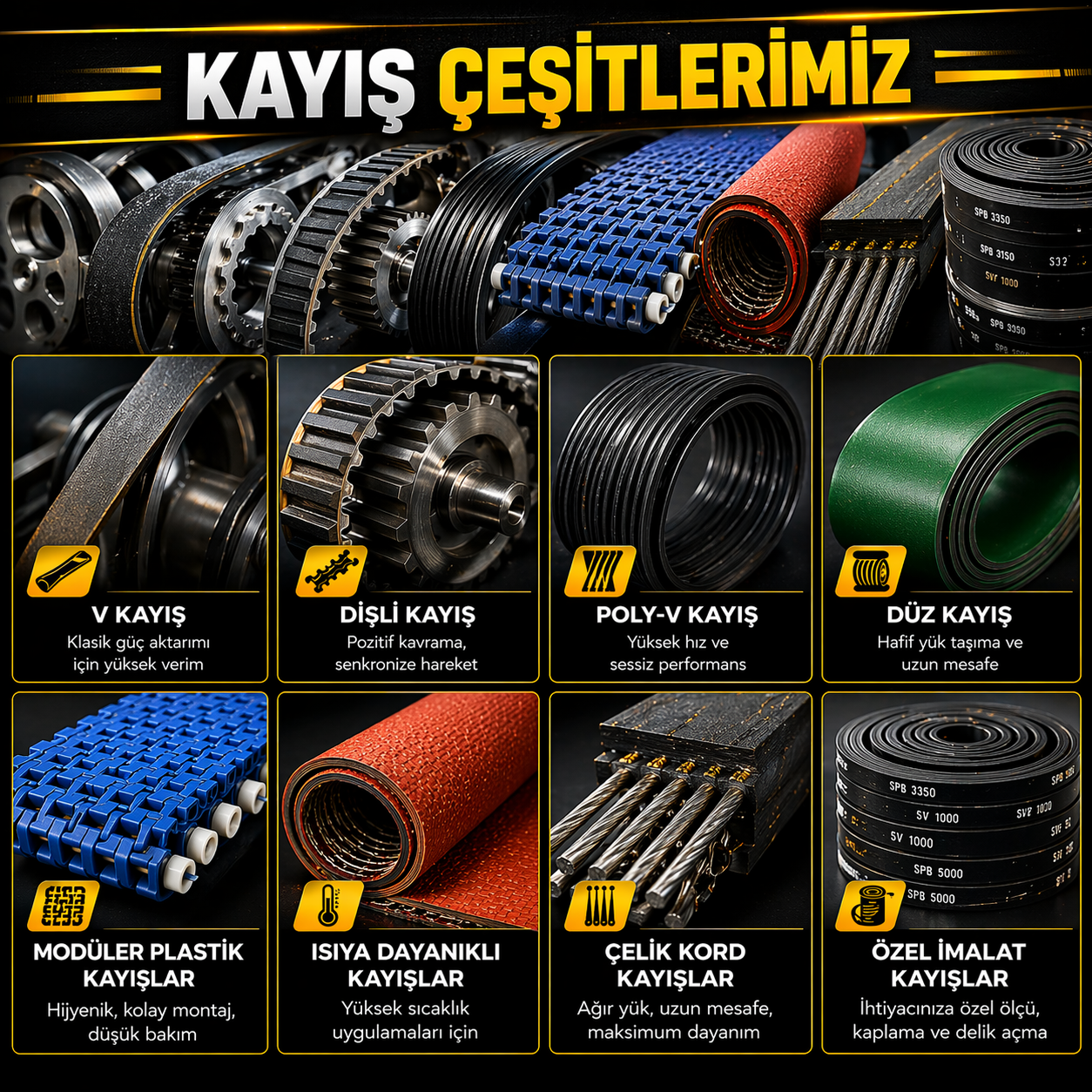 V kayış, dişli kayış, Poly-V kayış, düz kayış, modüler plastik kayışlar, ısıya dayanıklı kayışlar ve çelik kord kayışlar gibi geniş ürün yelpazemiz ile; ağır yük, yüksek hız ve zorlu çalışma koşullarına uygun çözümler sağlıyoruz.