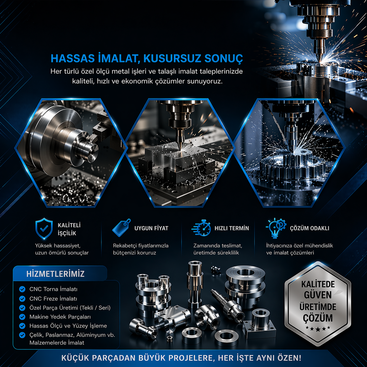 Torna, freze ve CNC alanlarında yüksek hassasiyetli ve kaliteli imalat çözümleri sunuyoruz.
