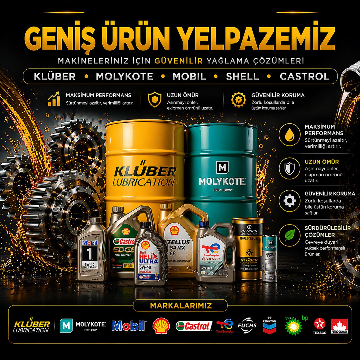 Klüber, Molykote, Mobil, Shell ve Castrol gibi dünya lideri markaların yüksek performanslı yağları ile; sürtünmeyi azaltır, aşınmayı önler ve ekipmanlarınızın daha stabil çalışmasını sağlarız.