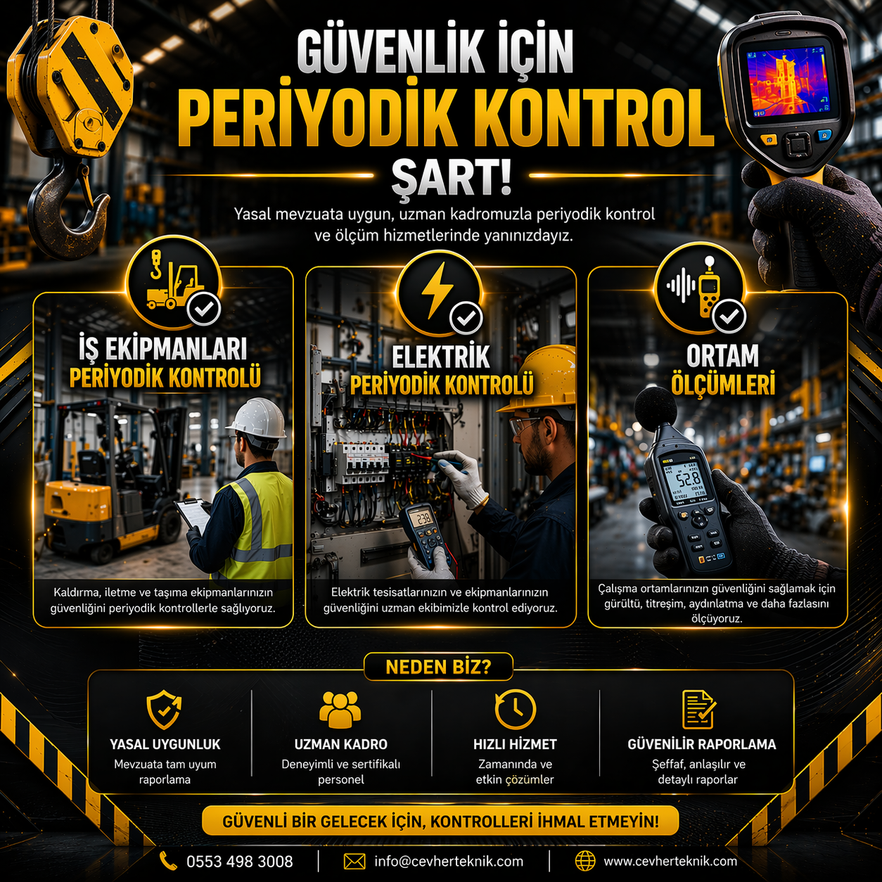 İş ekipmanları periyodik kontrolü, elektrik periyodik kontrolü ve ortam ölçümleri; işletmelerde iş güvenliğini sağlamak, yasal mevzuata uyumlu çalışmak ve olası riskleri önceden tespit etmek için büyük önem taşır. Kaldırma, iletme ve istifleme ekipmanlarından elektrik tesisatlarına, çalışma ortamındaki gürültü, aydınlatma ve titreşim gibi parametrelere kadar tüm kritik alanlar uzman ekipler tarafından detaylı şekilde analiz edilerek raporlanır. Bu kontroller sayesinde hem çalışan güvenliği artırılır hem de işletmelerin olası cezai yaptırımlarla karşılaşmasının önüne geçilir. Profesyonel ekipmanlar ve mühendislik yaklaşımıyla sunulan bu hizmetler, işletmenizin sürdürülebilir, güvenli ve verimli bir şekilde faaliyet göstermesine katkı sağlar.