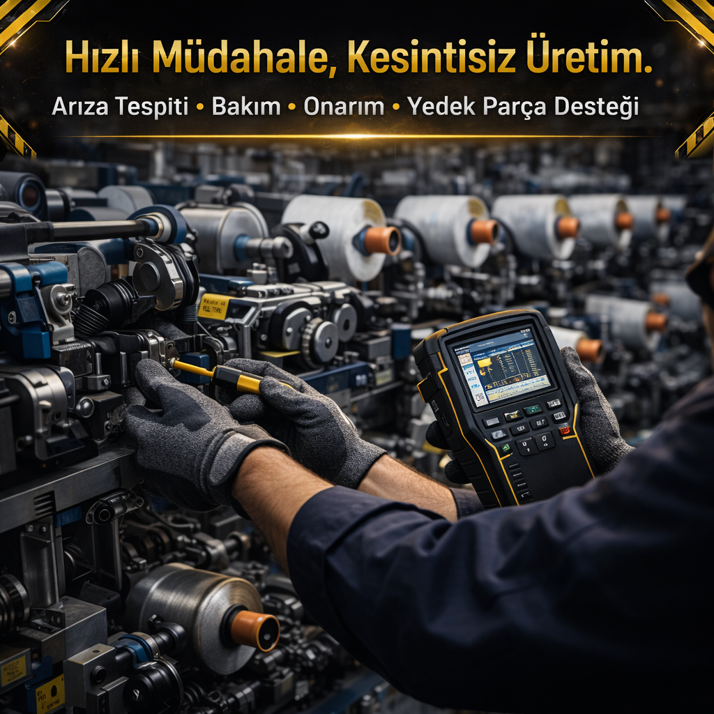 Tekstüre makinelerinde oluşan arızalar, üretim hattında zaman kaybına ve maliyet artışına neden olabilir. Bu nedenle hızlı müdahale, doğru arıza tespiti ve uzman teknik servis desteği büyük önem taşır. Tekstüre makineleri için bakım, onarım, arıza tespiti ve yedek parça desteği hizmetlerimizle, üretiminizin kesintisiz devam etmesine yardımcı oluyoruz. Makine performansını düşüren arızaları kısa sürede analiz ederek en uygun çözümü sunuyor, planlı bakım çalışmaları ile olası duruşların önüne geçiyoruz. Deneyimli teknik yaklaşımımız sayesinde hem mevcut ekipmanlarınızın ömrünü uzatıyor hem de üretim verimliliğinizi artırıyoruz. Güvenilir servis anlayışımız ile tekstüre makinelerinizde hızlı, etkili ve sürdürülebilir çözümler sağlıyoruz.