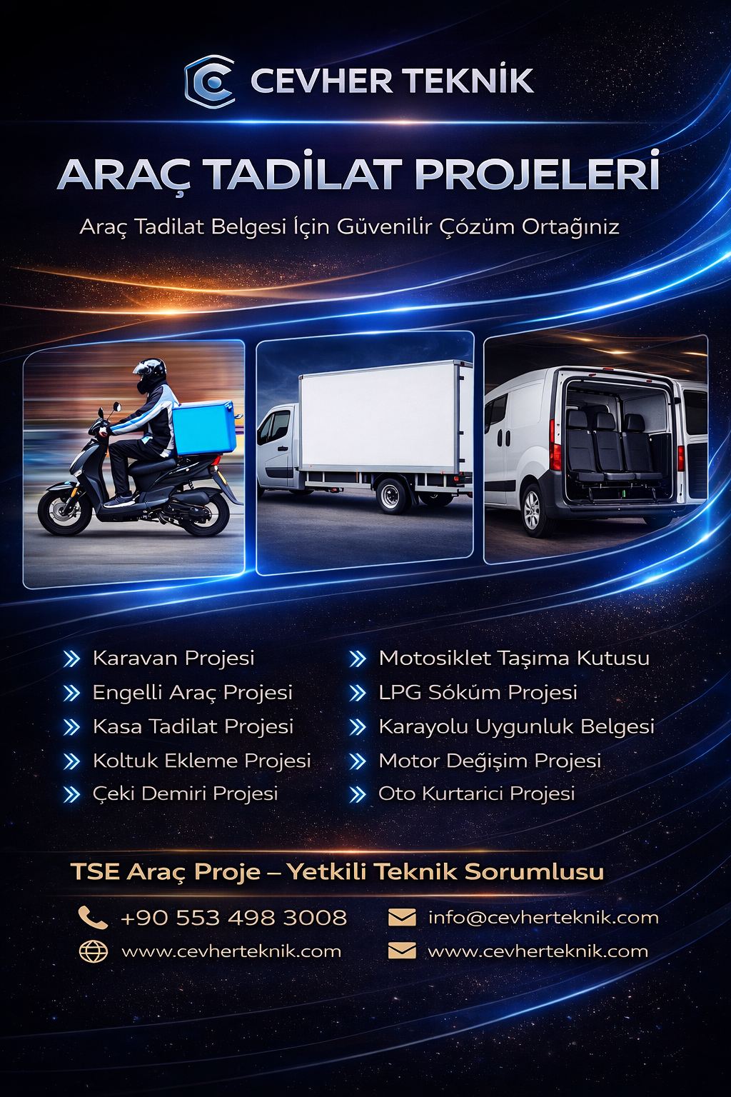 Araç tadilat projeleri, yapılan değişikliklerin mevzuata uygunluğunu belgeleyen ve aracın güvenli şekilde kullanılmasını sağlayan teknik çalışmalardır. Cevher Teknik olarak; araç üzerinde yapılan her türlü tadilatın TSE ve ilgili yönetmeliklere uygun şekilde projelendirilmesini profesyonel olarak hazırlıyoruz.